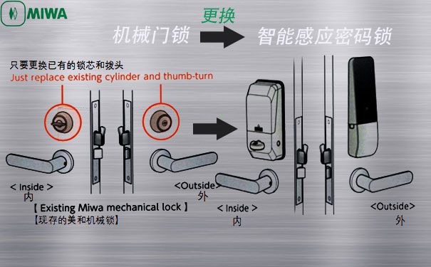 如果我們家里已經是用的MIWA美和鎖,我想把入戶門鎖換成感應密碼鎖,可不可以呢?回答是肯定的,只需要換鎖芯旋鈕就可以了,一把新型的感應密碼入戶門鎖就組成了,它將牢牢地守住咱們溫暖的家。